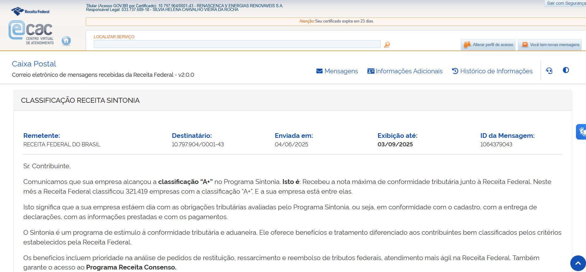 巴西公司下屬項目公司獲得巴西稅務最高評級A+